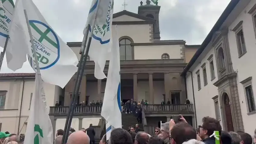 Folla di militanti all’abbazia di San Giacomo per i funerali del fondatore della Lega. Cori per la “Padania libera” e applausi per Zaia, ma all’arrivo del leader leghista scattano fischi e insulti: «Molla la camicia verde»