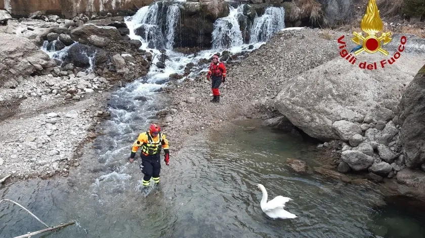 Alleghe, cigno in trappola salvato dai vigili del fuoco