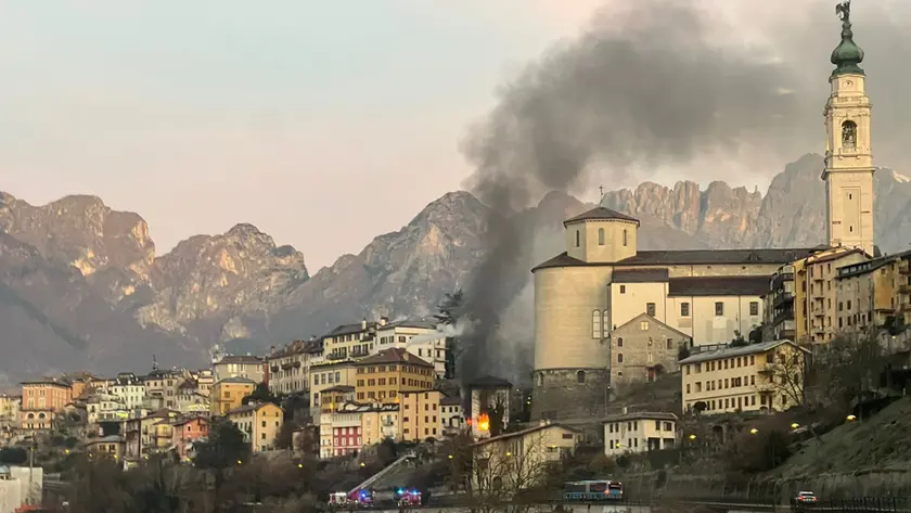 Fiamme in un appartamento in centro storico a Belluno, paura e colonna di fumo