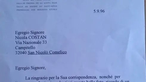 Poi Nicola ci pensa su e decide di scrivere in Vaticano a Joaquin Navarro-Valls chiedendo di poter avere una foto di quell’incontro, e allegando anche un piccolo assegno per le spese di stampa. Del 29 luglio una prima risposta della segreteria della Sala Stampa che comunica che Navarro è dovuto partire per l’estero subito dopo il suo rientro dal Cadore e “non ha avuto tempo di far sviluppare le fotografie. Mi ha comunque pregata di assicurarLa che le farà giungere le fotografie quando saranno pronte”. Del 5 settembre 1996 la risposta dello stesso Navarro-Valls, sempre su carta intesta della Sala Stampa Vaticana: “Egregio sig. Costan, La ringrazio per la Sua corrispondenza, nonché per l’assegno. Le invio volentieri questa bella foto, ricordo di un incontro eccezionale, e Le restituisco quanto da Lei inviatomi, troppo per una spesa così modesta. Con distinti saluti. Dr. Joaquin Navarro-Valls, Direttore”. «Fu un’altra emozione», ricorda Nicola Costan, «ricevere questa bella lettera e questa fotografia» .