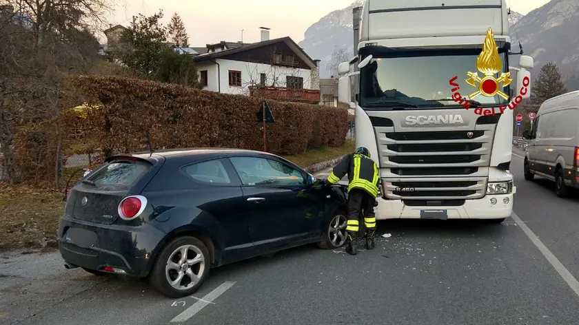 Incidente stradale a Faè di Longarone, lungo la statale Alemagna, questo pomeriggio (1° febbraio) attorno alle 16.30. A scontrarsi, con un impatto avvenuto per fortuna a velocità limitata, sono stati un Tir e un’auto, una MiTo dell’Alfa. Fanale destro, contro fanale destro, in una traiettoria quasi frontale.