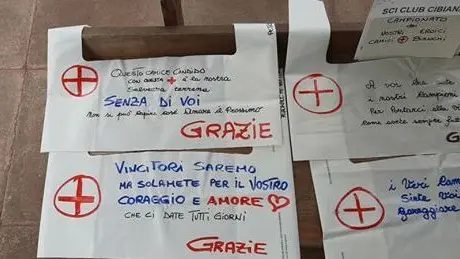 Così Olivotti, che ama lo sport, da anni nello Sci club Cibiana, ha costruito dei pettorali sui quai ha scritto frasi come: “A voi che siete i nostri campioni, grazie, per portarci alla vittoria contro di Lui”. «Volevo solo dire grazie e far sapere a tutti che abbiamo dei veri campioni che lavorano per tutti noi 24 ore su 24». —