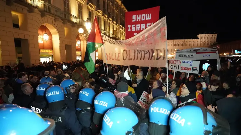 (ANSA) - TORINO, 11 GEN - In piazza Castello a Torino, dove si conclude oggi il percorso piemontese della torcia dei Giochi invernali Milano Cortina 2026, si sono radunati gruppi di manifestanti. Su uno striscione e su alcuni cartelli si legge: "Fuori Israele dalle Olimpiadi", su altri: "Complice di genocidio", "No sport Washing", "Show Israel the Red Card", "Il genocidio non è una specialità olimpica", "Israele viola la tregua olimpica" e sono presenti bandiere della Palestina. Altri manifestanti espongono la bandiera del Venezuela, con la scritta: "Maduro libero". I manifestanti sfilano tra la gente in piazza per l'arrivo della Fiamma. (ANSA).