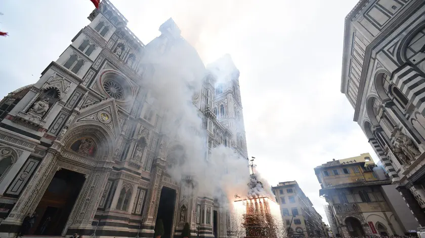 (ANSA) - FIRENZE, 05 APR - Vola bene la 'colombina' in piazza Duomo a Firenze per lo Scoppio del carro, tradizione popolare per Pasqua che si tramanda da oltre nove secoli: la rievocazione ripercorre le gesta dei fiorentini alle Crociate e del loro ritorno in città nel 1101. La 'colombina' è il congegno trasportato da un razzo innescato dal cero santo - 'accensione' a opera dell'arcivescovo di Firenze, monsignor Gherardo Gambelli, all'interno della Cattedrale -, che 'incendia' il carro posizionato tra Duomo e Battistero, o meglio i petardi e i fuochi pirotecnici di cui è corredato. In una giornata di sole e con una piazza come sempre gremita di migliaia di persone tra fiorentini e turisti, la 'colombina', partita dall'altare della Cattedrale, ha raggiunto all'esterno il carro di fuoco, detto Brindellone, e poi è tornata indietro, lungo la navata centrale, senza problemi. La tradizione tramanda che se riesce a volare e a rientrare senza intoppi è segno di speranza e di buoni raccolti. Come da tradizione anche la benedizione alla folla e al Brindellone, prima che fosse acceso, da parte di monsignor Gambelli. Dopo lo Scoppio del carro la rrosecuzione della messa in Duomo, celebrata dall'arcivescovo. Tra i presenti la sindaca di Firenze Sara Funaro e anche il presidente della Toscana Eugenio Giani. La storia affida a Pazzino de' Pazzi, al ritorno da una crociata nel 1099, le origini dello Scoppio del carro. Fu Pazzino, a riportare alcune pietre focaie del sepolcro di Cristo con le quali poi a Firenze venivano illuminate le celebrazioni del Sabato santo. In un secondo tempo la cerimonia venne spostata alla domenica e i fiorentini decisero di costruire un carro trionfale, detto Brindellone, che ancora oggi è scortato fino in piazza Duomo dagli armigeri del Comune nei tipici costumi. La forma attuale del carro risale al '600. Per tutto l'anno il Brindellone resta in un apposito deposito di via il Prato e il giorno di Pasqua arriva al Duomo trascinato da quattro buoi, agghindati per la festa. (ANSA).
