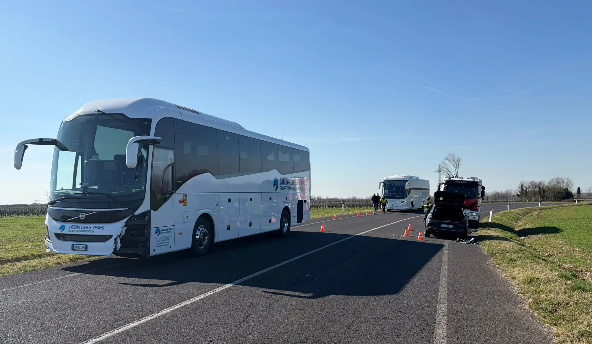 Sul posto anche una squadra dei vigili del fuoco del Comando provinciale di Udine che, oltre a controllare e a mettere in sicurezza i mezzi, ha anche supportato la polizia locale nelle operazioni di trasferimento dei circa cinquanta turisti di Jesolo a bordo di secondo autobus arrivato in supporto.