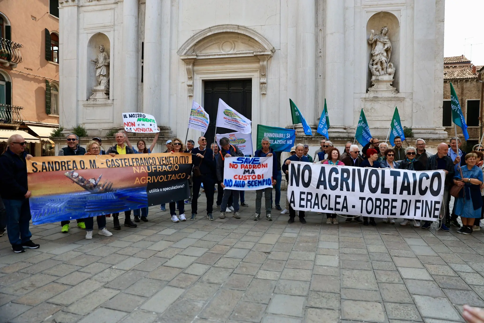 In campo San Tomà anche Andrea Grigoletto del comitato di Tessera; Michele Boato, rappresentante della lista civica “Ambiente Bene Comune”, parte della coalizione “Tutta la città che vogliamo” a sostegno della candidatura a sindaco di Venezia di Giovanni Andrea Martini, e candidato presidente alla Municipalità di Mestre, e Jonatan Montanariello, consigliere regionale del Pd: «Condividiamo appieno le richieste dei comitati», dice il dem. «Non siamo contro la svolta rispetto alle fonti fossili ma va sviluppata con intelligenza, non dappertutto. Chiederò l’audizione dei comitati e dei proprietari delle aree interessate dagli impianti agrivoltaici che stanno nascendo nel Veneziano. Il Veneto è orfano della sua incapacità di legiferare. Abbiamo introdotto il termine di “aree di pregio” quando la norma nazionale parla di “aree idonee”, ora vige il caos. La legge ci consente di intervenire in modo chirurgico ma il pasticcio amministrativo tutto targato regione Veneto non agevola».