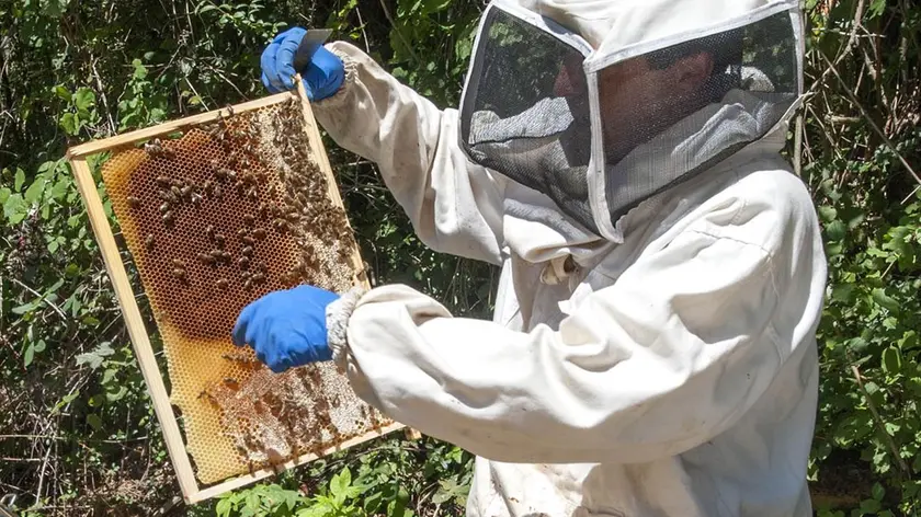 Luca Stefani, presidente del consorzio Apidolomiti, al lavoro per prelevare il miele dalle sue arnie