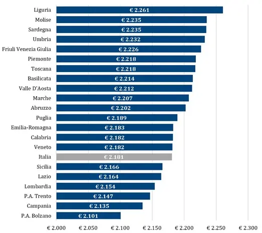 - nel 2024 la regione ha ricevuto € 2.182 pro-capite, cifra lievemente superiore alla media nazionale di € 2.181.